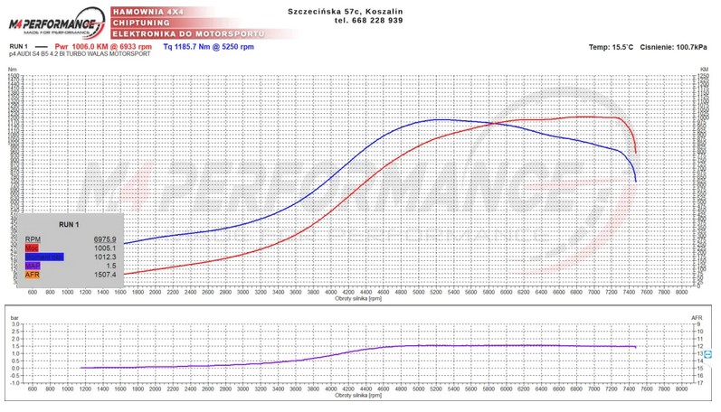Nestled beneath the hood is a twin-turbo 4.2L (BCY) V8 engine borrowed from an Audi RS 6. But WALAS Motorsport didn’t stop there. They fitted it with JRspec GT3076R turbochargers from FMIC.PL, pushing this beauty to a jaw-dropping 1006 horsepower at 6,933 rpm and a massive 1185 Nm (874 lb-ft) of torque at 5,250 rpm, thanks to 1.5 bar (21.7 psi) of boost.